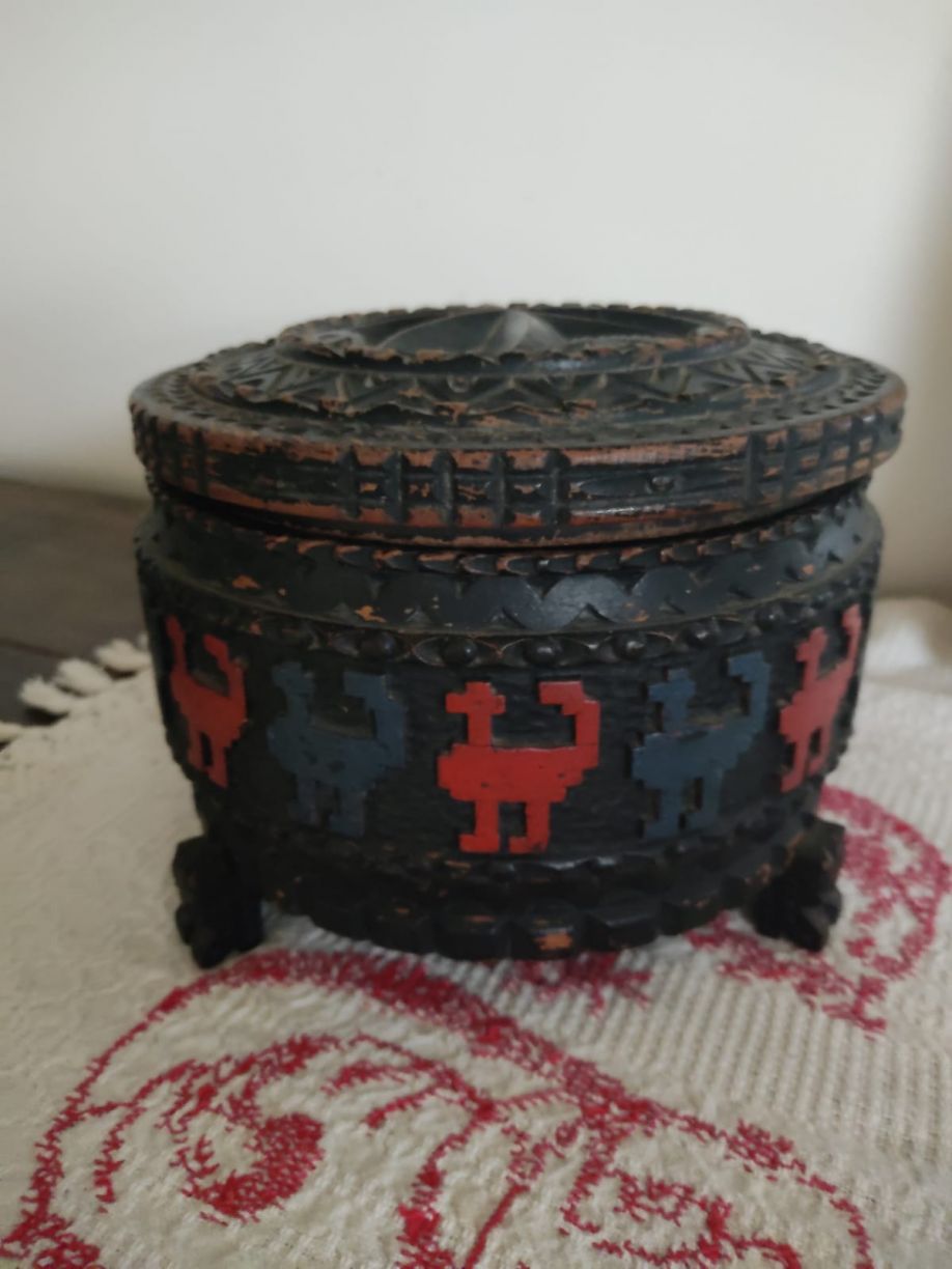 Cofanetto in legno intagliato sardo raffigurante le gallinelle colorate periodo Primo '900.